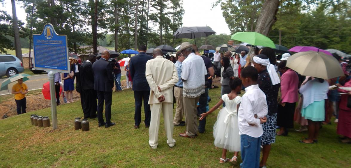 Dozens participated in the dedication ceremony at Rehobeth Missionary Church in Letohatchee, braving the rain to pray and reflect together on the history of racial terrorism in Lowndes County.