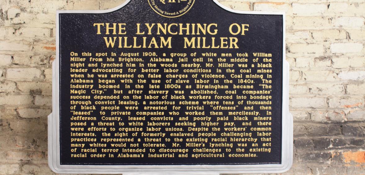This weekend, the Equal Justice Initiative will dedicate a new historical marker near Brighton City Hall that documents the 1908 lynching of William Miller. Mr. Miller was an African American coal miner who was seeking better wages for Black workers and was murdered by a white mob. The marker in Brighton will be dedicated on Sunday, December 13. The dedication will be followed by a reception and award ceremony with the high school winners of the 2015 Racial Justice Essay Contest.