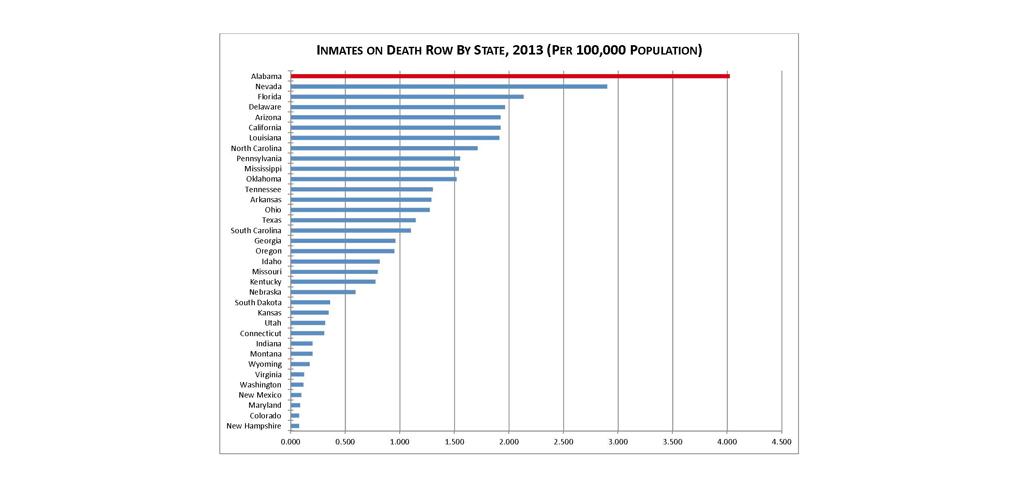 In the face of growing evidence about the unreliability of the death penalty, and in sharp contrast with national trends, Alabama once again had the highest death sentencing rate in the United States in 2013. With five new death sentences, Alabama’s per capita death sentencing led the nation.