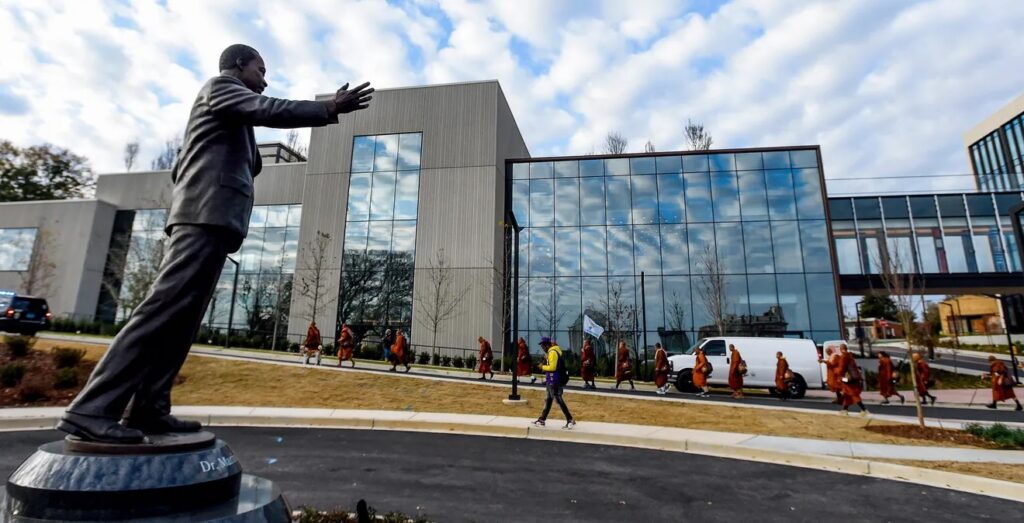 The monks walked by Elevation Convening Center and Hotel, and EJI’s new sculpture of Dr. Martin Luther King Jr.