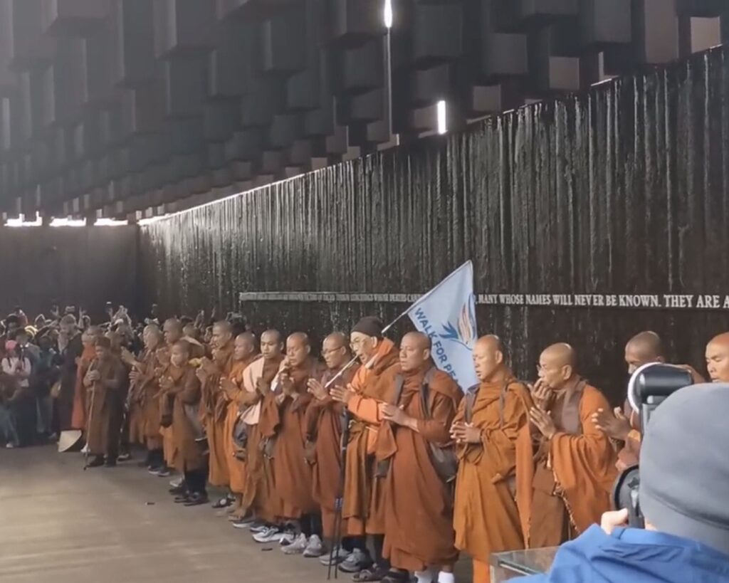 Yesterday, Buddhist monks on the Walk for Peace—a 120-day, 2,300-mile long journey from Fort Worth, Texas, to Washington, D.C. to promote peace, loving kindness, and compassion across the nation and the world—passed through Montgomery, Alabama. The group visited the National Memorial for Peace and Justice where they stopped for a prayer amidst many local residents and supporters.